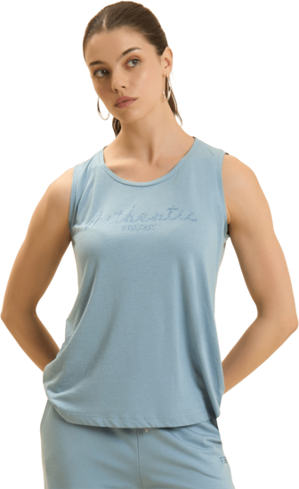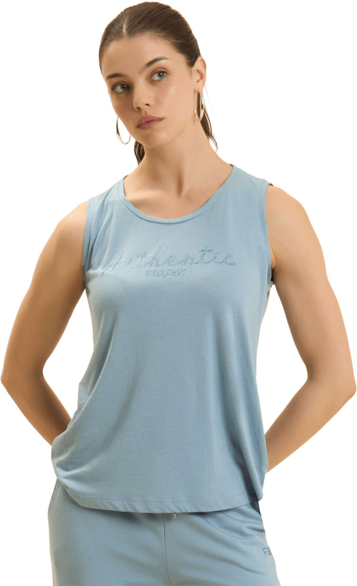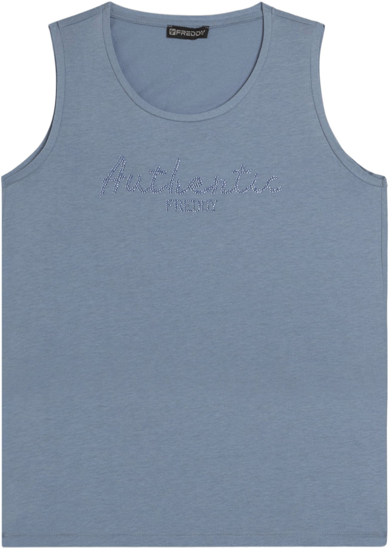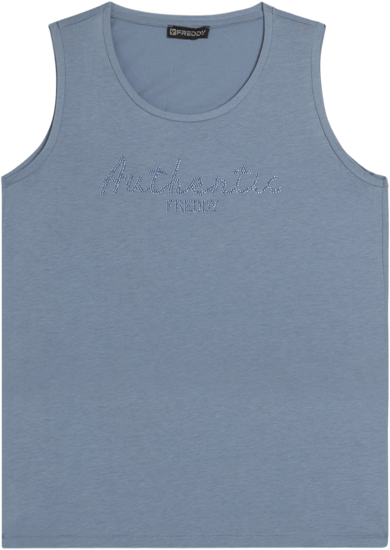Canotta con vestibilità e lunghezza regular, dal fondo leggermente svasato con piccoli spacchi laterali. Scollo girocollo e spalline larghe completano il design semplice e femminile. La scritta \Authentic\" e il logo FREDDY, entrambi realizzati con strass in tono colore, decorano il fronte, aggiungendo luminosità. Il tessuto Jersey in Cotone e Modal assicura morbidezza, comfort e una piacevole sensazione di freschezza grazie alla sua texture liscia e leggera."