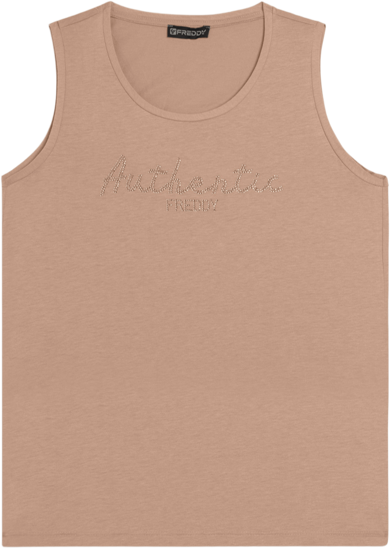 Canotta con vestibilità e lunghezza regular, dal fondo leggermente svasato con piccoli spacchi laterali. Scollo girocollo e spalline larghe completano il design semplice e femminile. La scritta \Authentic\" e il logo FREDDY, entrambi realizzati con strass in tono colore, decorano il fronte, aggiungendo luminosità. Il tessuto Jersey in Cotone e Modal assicura morbidezza, comfort e una piacevole sensazione di freschezza grazie alla sua texture liscia e leggera."