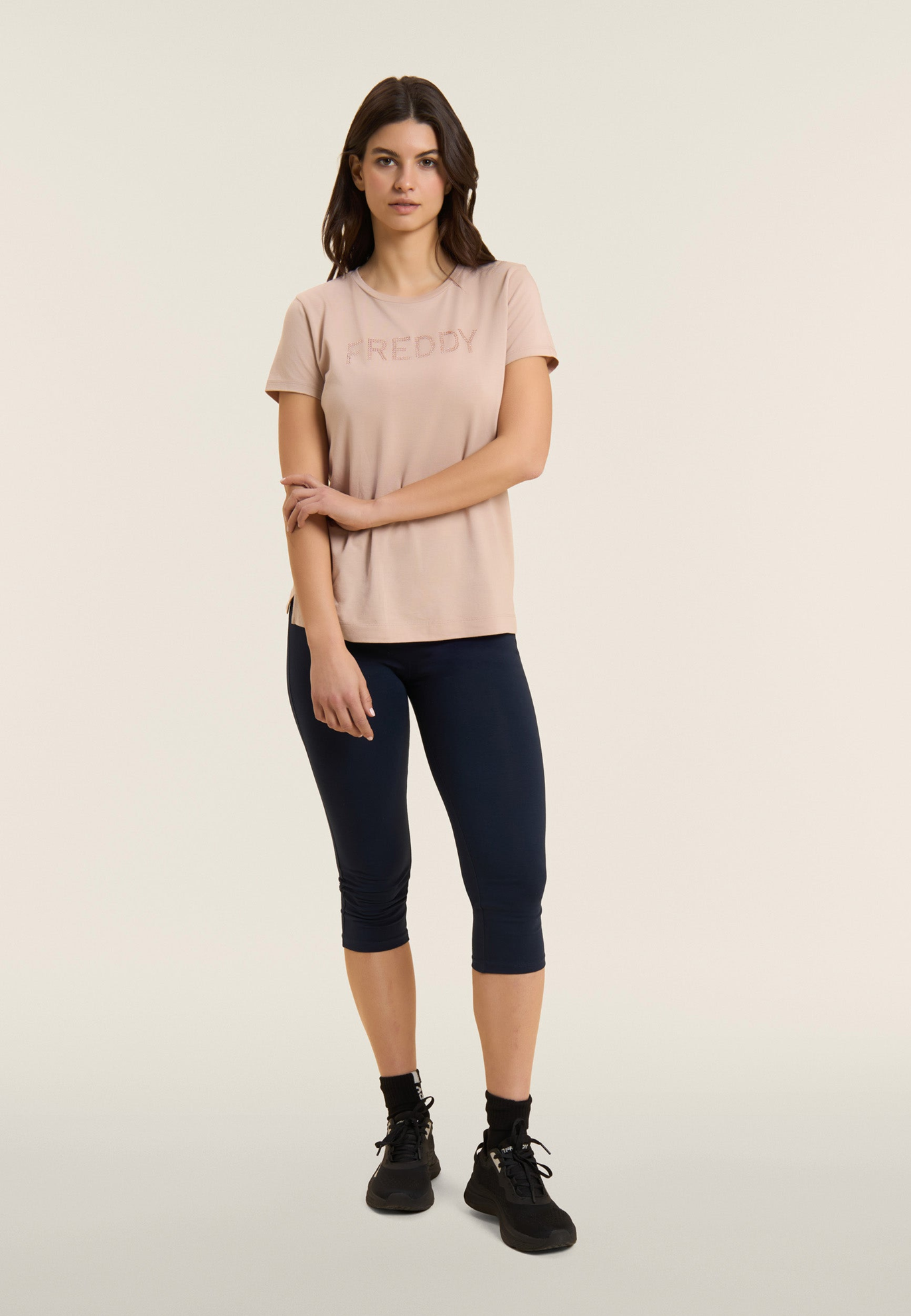 Leggings corsaro dal design slim, con vita regular e cuciture a cuore sul carrè posteriore per un tocco di eleganza. Il logo FREDDY sulla tasca sinistra in perline rosa chiaro completa il look. Realizzati in jersey pesante stretch di cotone, sono ideali per attività leggere e per un look casual ma ricercato.