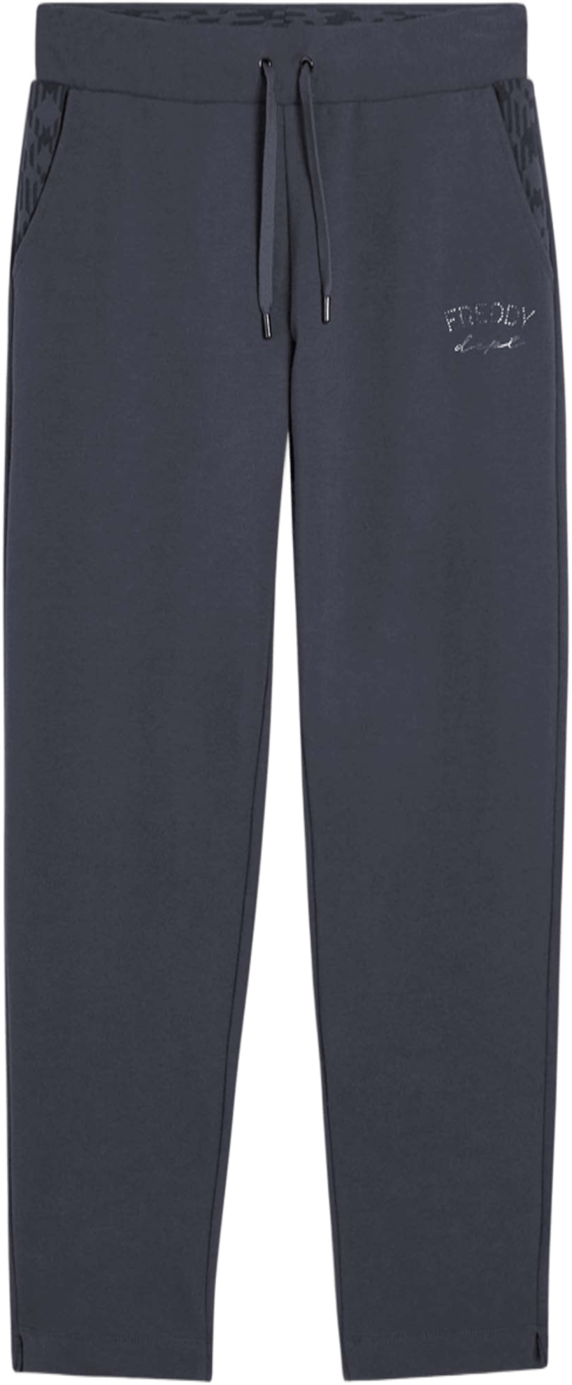 Pantaloni sportivi regular fit con fondo gamba dritto e piccoli spacchi laterali per maggiore libertà nei movimenti. La vita regular ha coulisse e l’interno delle tasche e della fascia in vita è decorato con fantasia geometrica. Il logo FREDDY in borchie decora il fianco sinistro. Tasche interne alla francese.