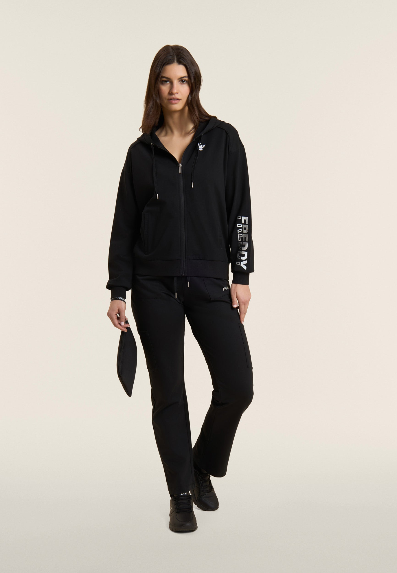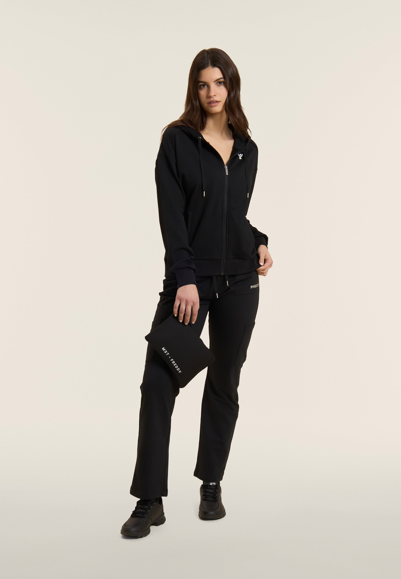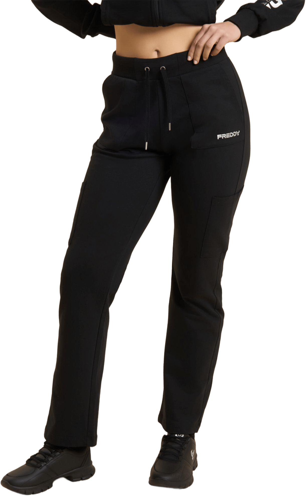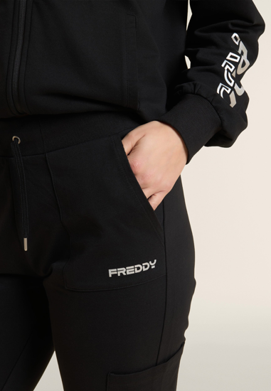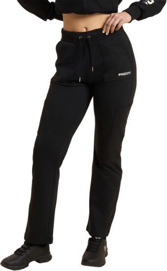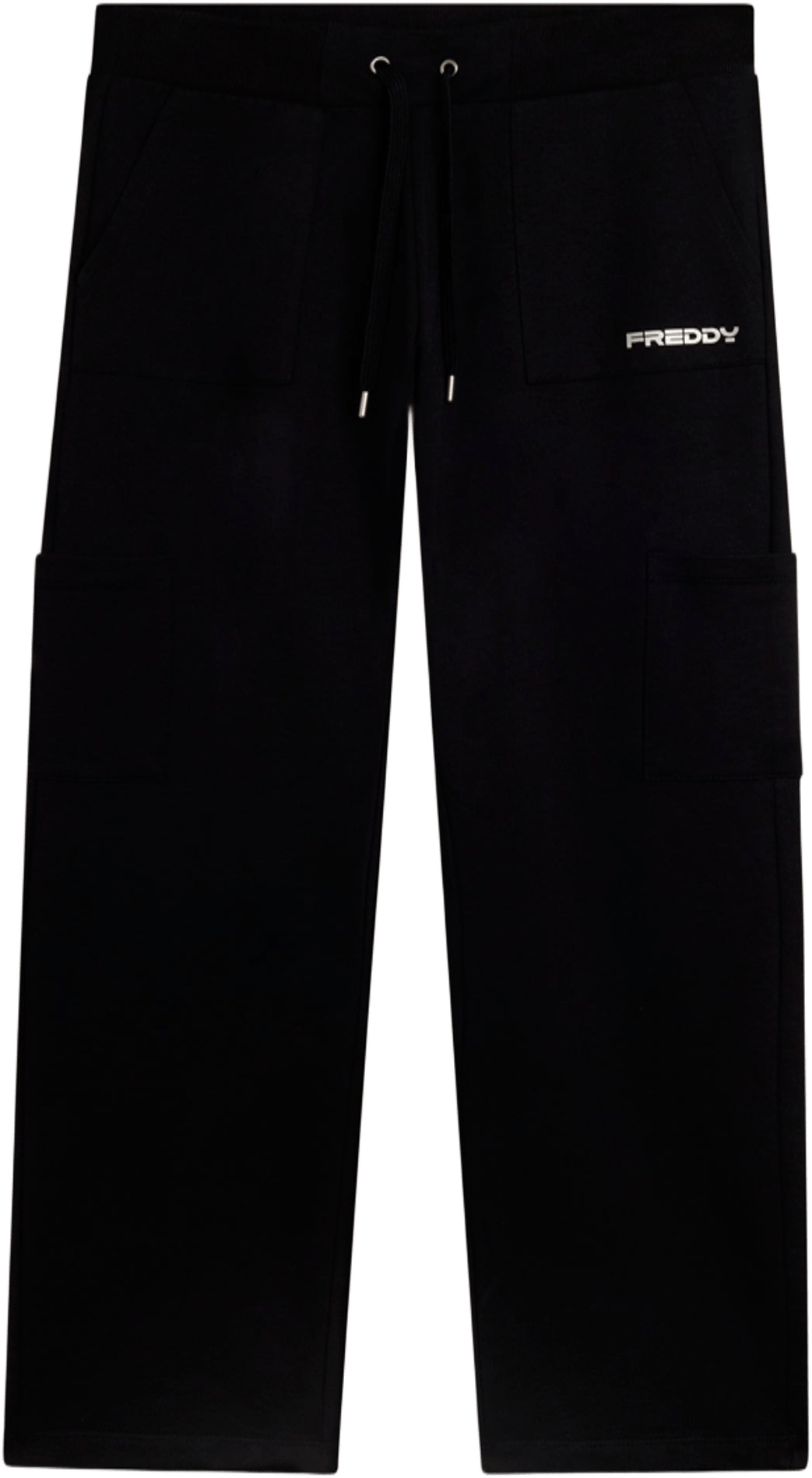 Pantaloni sportivi in heavy jersey stretch di cotone, pensati per offrirti comfort e funzionalità durante le attività quotidiane. Il modello ha una vestibilità e lunghezza regular, con vita regular rifinita da una fascia in costina con coulisse regolabile. La gamba è dritta con fondo regolare per un fit naturale. Le tasche applicate sui fianchi e lungo la gamba aggiungono praticità e un tocco utility, mentre il piccolo logo FREDDY con finish perlato sulla tasca sinistra completa il look con discreta eleganza.