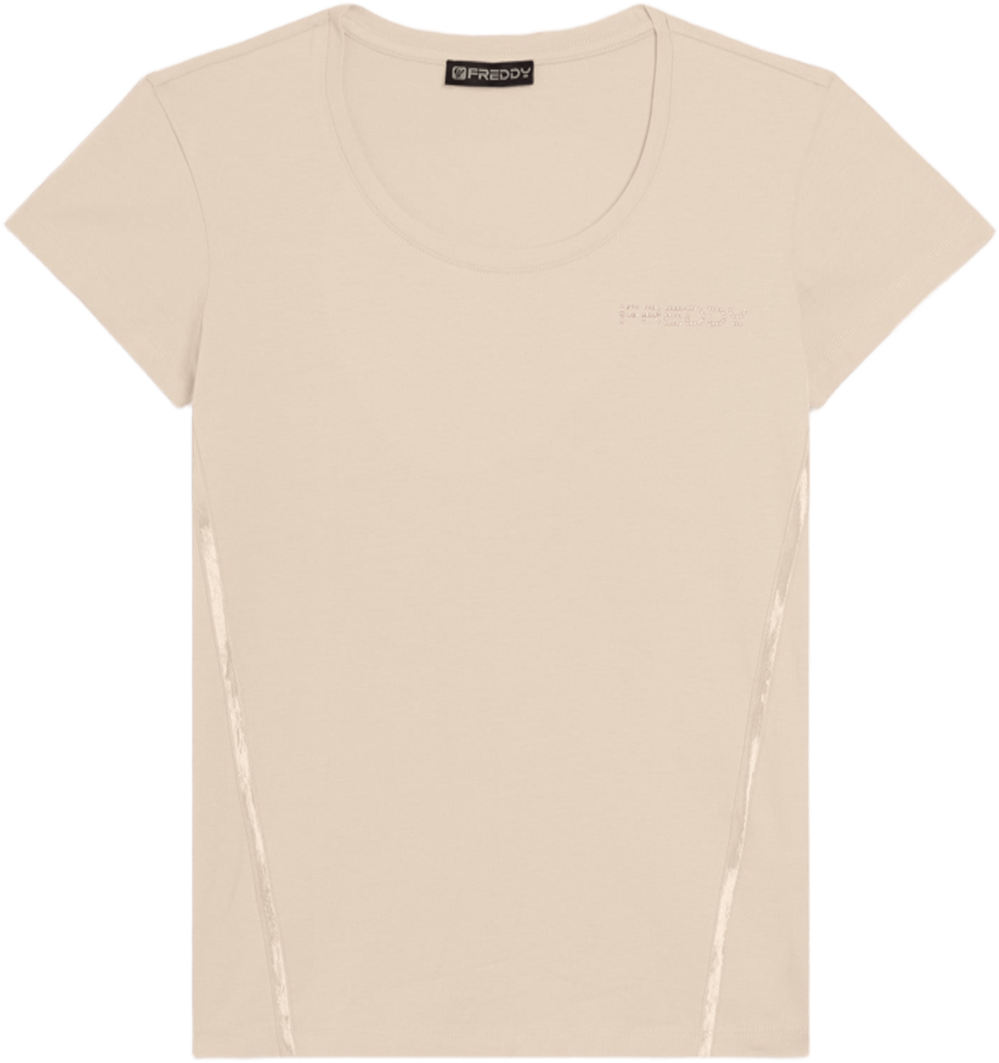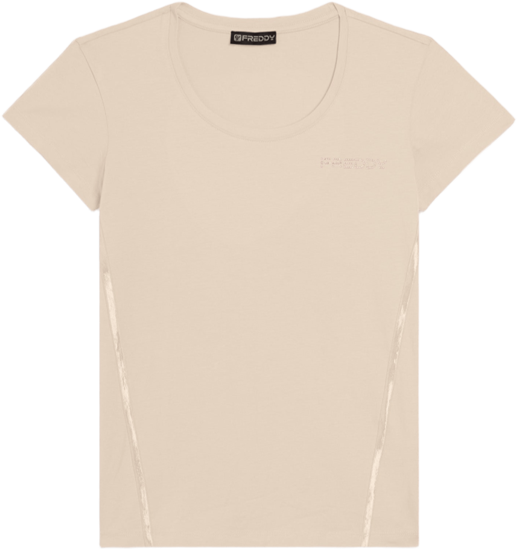 T-shirt manica corta con scollo girocollo e maniche molto corte, dal design essenziale ma raffinato. Il logo FREDDY in perline rosa chiaro sul cuore e gli inserti elastici laterali dal finish lucido decorano con eleganza. La vestibilità regular e il fondo dritto la rendono comoda e versatile, adatta per le attività quotidiane. Realizzata in jersey leggero stretch di cotone, offre un comfort duraturo.
