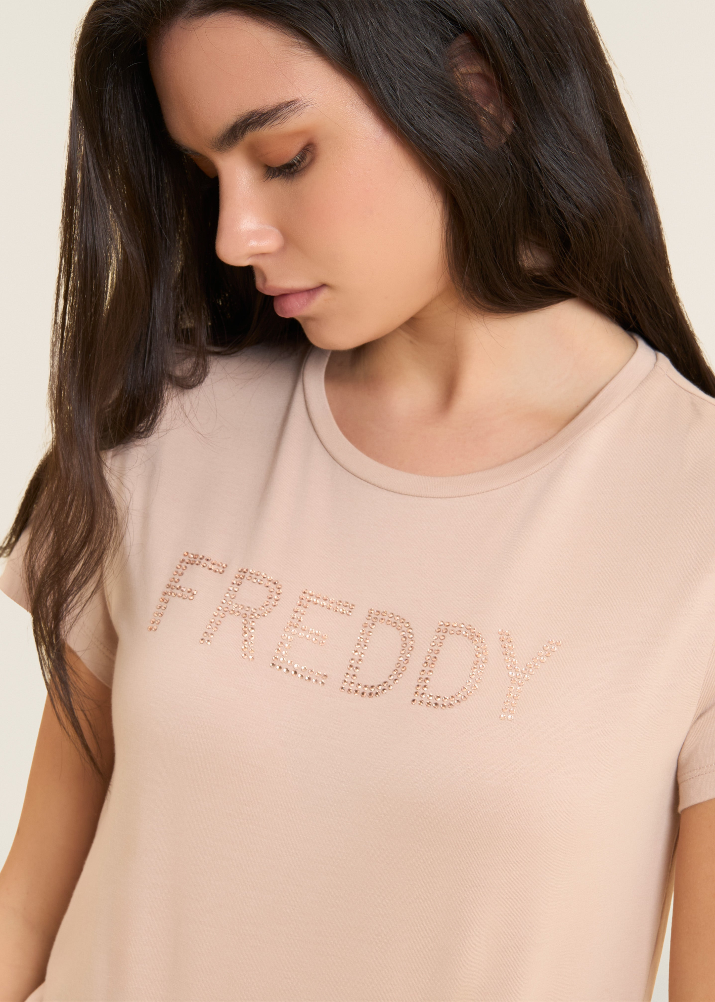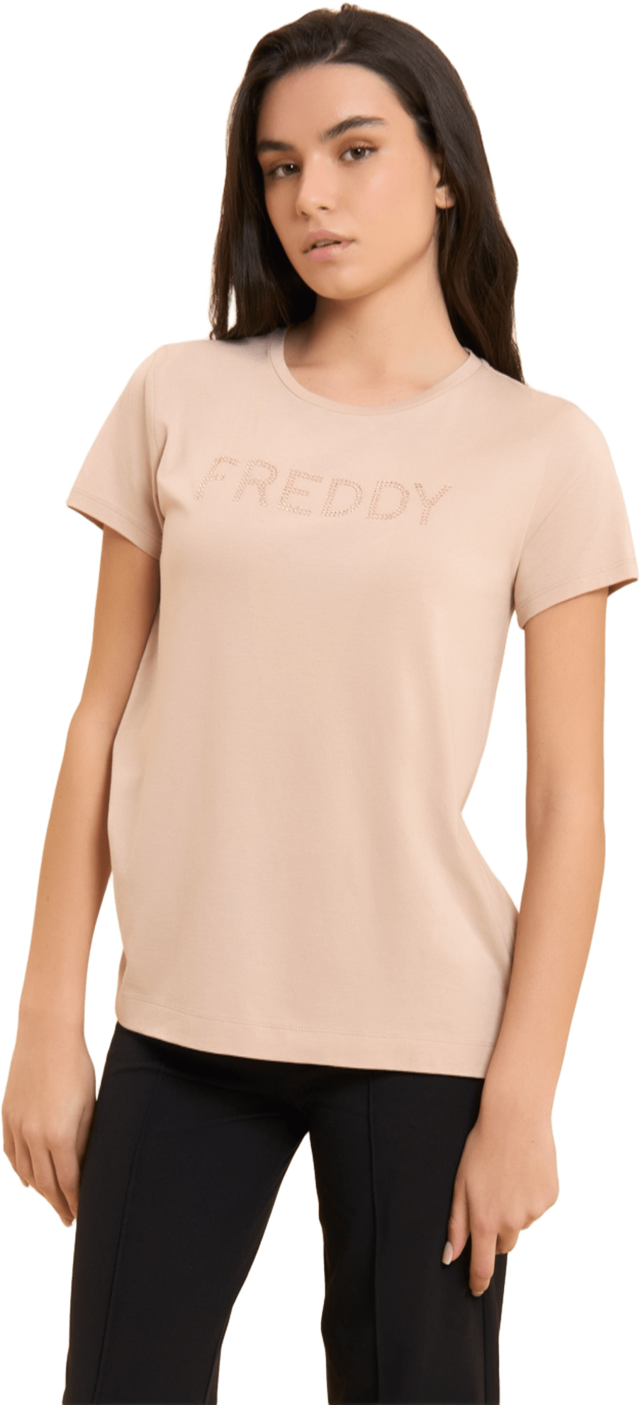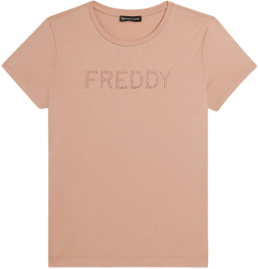 T-shirt a manica corta con vestibilità e lunghezza regular, caratterizzata da fondo dritto con piccoli spacchi laterali. Lo scollo girocollo e le maniche corte creano una forma versatile e confortevole. Il logo FREDDY sul petto, realizzato in strass in tono colore, aggiunge un tocco di brillantezza. Il tessuto Jersey in Cotone e Modal, morbido e traspirante, assicura comfort per tutta la giornata, con una texture liscia e leggera che rende il capo ideale per un look casual e raffinato.