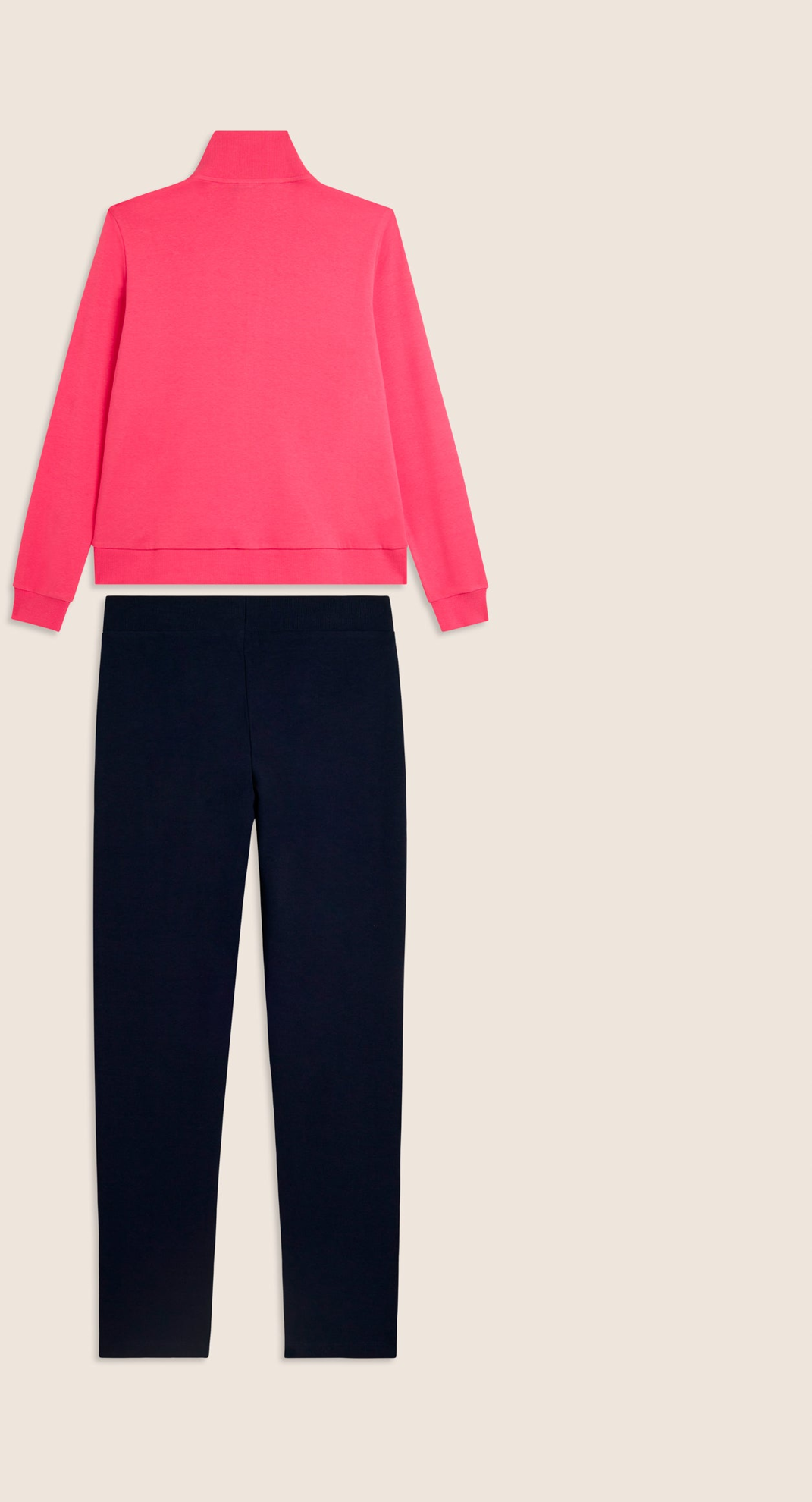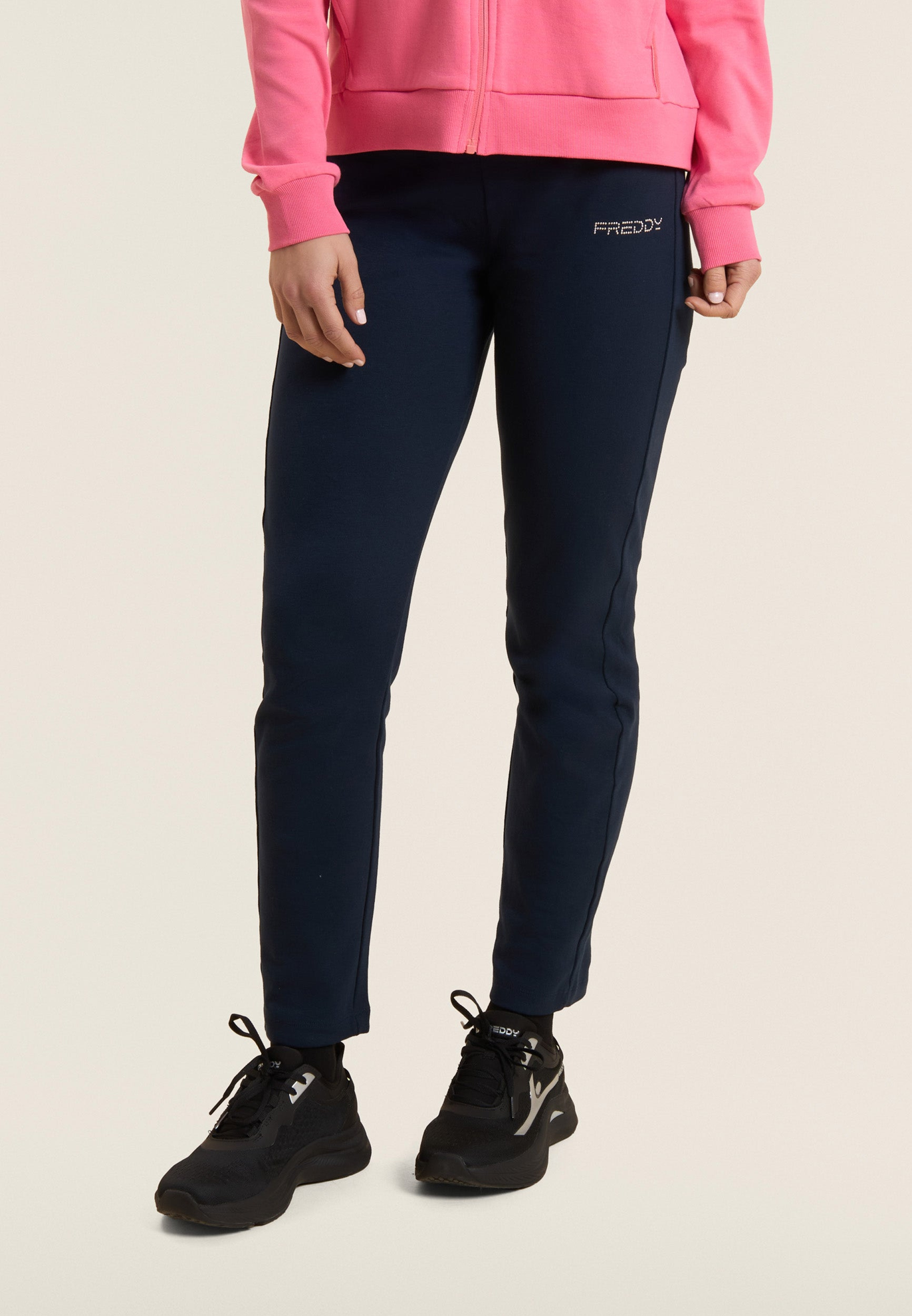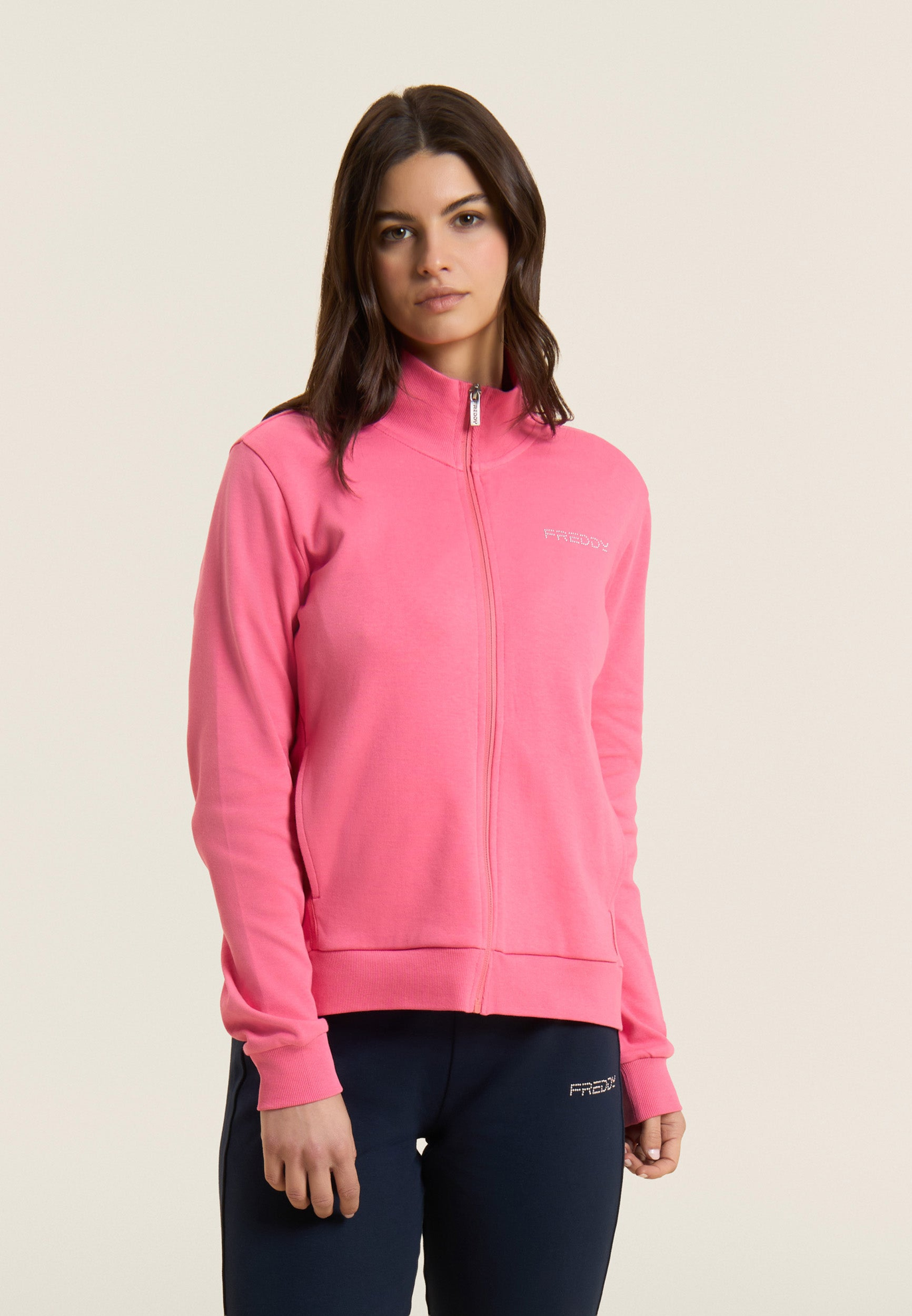 Tuta dallo stile essenziale in interlock di 100% cotone, ideale per il relax e il tempo libero. La felpa presenta collo alto in costina, zip tono su tono e fondo con fascia in costina. I pantaloni, con vestibilità regular, hanno vita con coulisse interna e fondo dritto. Logo FREDDY in perline rosa chiaro su cuore e fianco. Tasche anteriori interne su felpa e pantaloni.