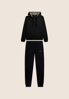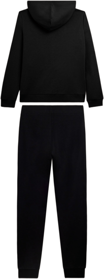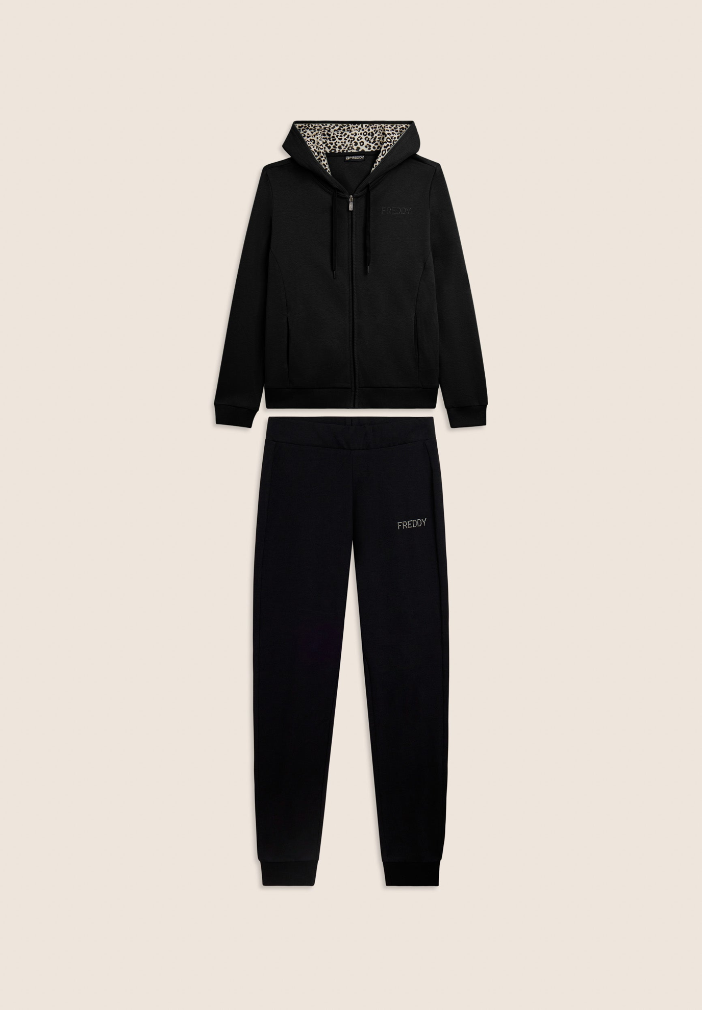 Grinta e femminilità in questa tuta in interlock di 100% cotone. La felpa ha cappuccio foderato in jersey stampato animalier e coulisse, zip tono su tono, fondo e polsini in costina. I pantaloni, regular fit, hanno vita con coulisse interna e fondo a polsino. Logo FREDDY in perline argento su cuore e fianco. Tasche anteriori interne sulla felpa.