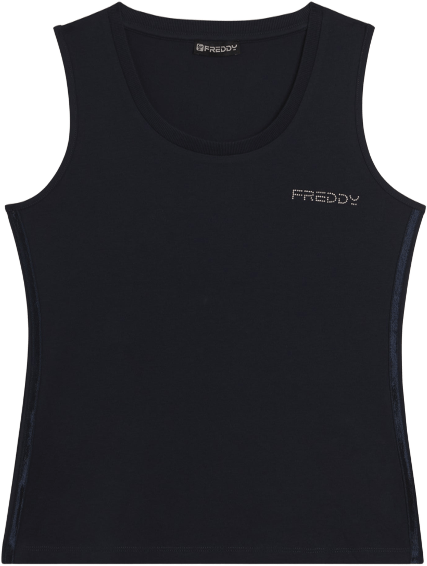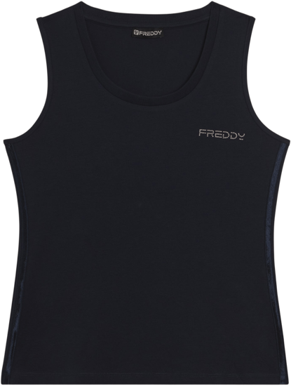 Canotta dal design essenziale e comodo, con scollo tondo e spalline ampie. La vestibilità regular e il fondo dritto assicurano un fit confortevole. Il logo FREDDY in perline rosa chiaro sul cuore e gli inserti elastici laterali lucidi decorano con eleganza. Perfetta per attività leggere, è realizzata in jersey leggero stretch di cotone.