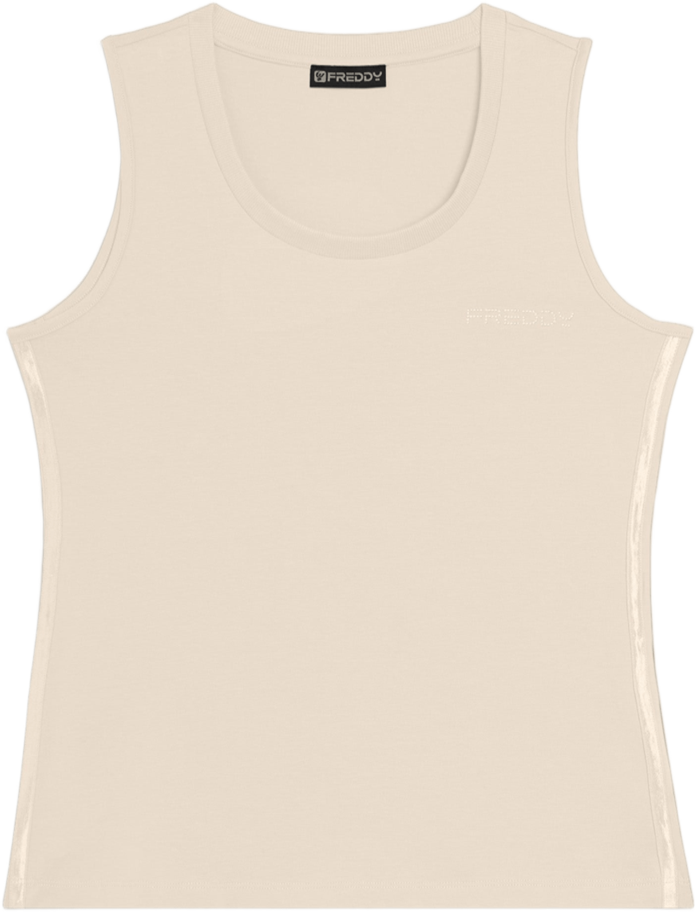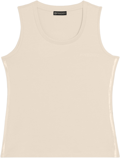Canotta dal design essenziale e comodo, con scollo tondo e spalline ampie. La vestibilità regular e il fondo dritto assicurano un fit confortevole. Il logo FREDDY in perline rosa chiaro sul cuore e gli inserti elastici laterali lucidi decorano con eleganza. Perfetta per attività leggere, è realizzata in jersey leggero stretch di cotone.