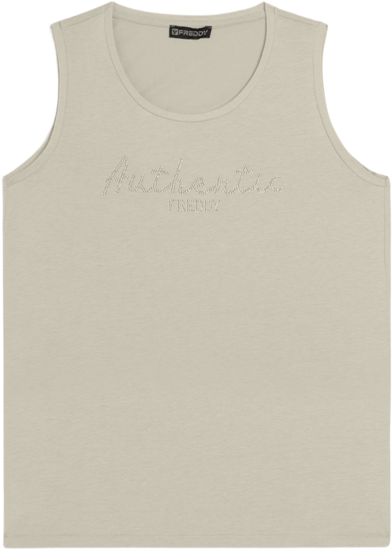 Canotta con vestibilità e lunghezza regular, dal fondo leggermente svasato con piccoli spacchi laterali. Scollo girocollo e spalline larghe completano il design semplice e femminile. La scritta \Authentic\" e il logo FREDDY, entrambi realizzati con strass in tono colore, decorano il fronte, aggiungendo luminosità. Il tessuto Jersey in Cotone e Modal assicura morbidezza, comfort e una piacevole sensazione di freschezza grazie alla sua texture liscia e leggera."