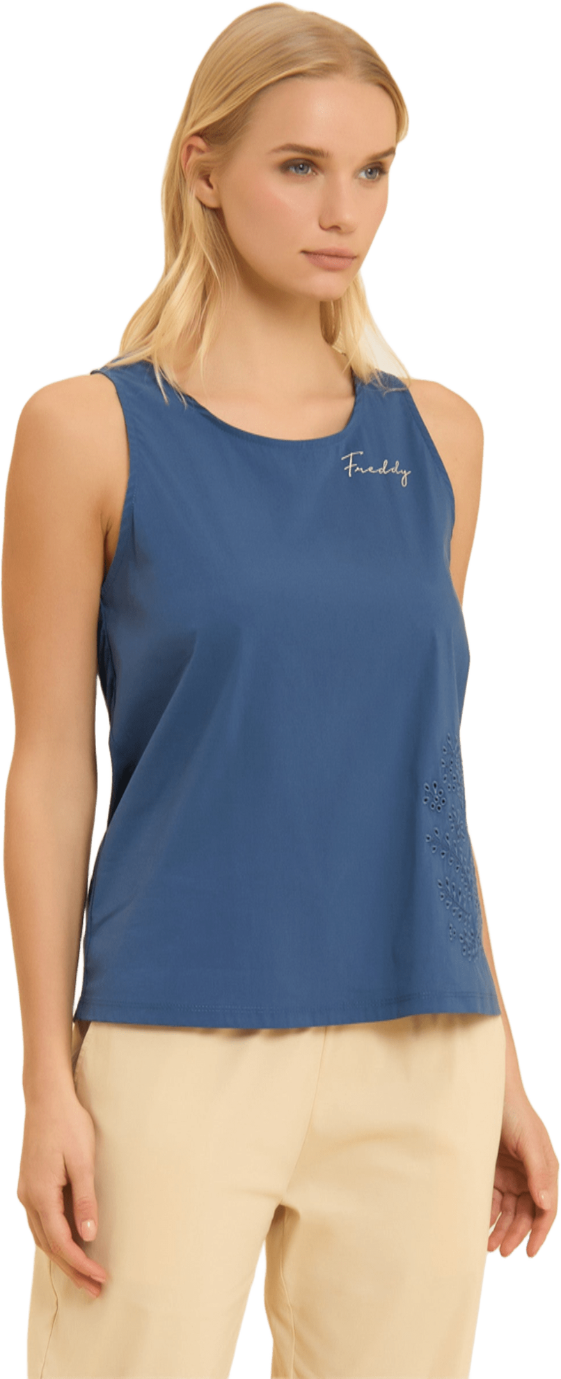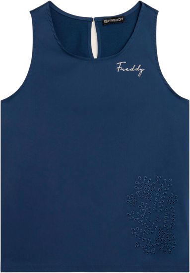 Canotta dalla vestibilità regular e lunghezza standard, con fondo leggermente svasato e scollo girocollo. Il dettaglio dell'apertura sul retro chiusa da bottone e le spalline regular donano un tocco di stile in più. Il fronte è in Popeline elasticizzato, decorato sul fondo da un ricamo floreale stile sangallo, mentre un piccolo logo Freddy ricamato sul cuore completa il look. Realizzata in jersey di cotone e modal, questa canotta è perfetta per un outfit casual e chic, garantendo morbidezza e comfort.