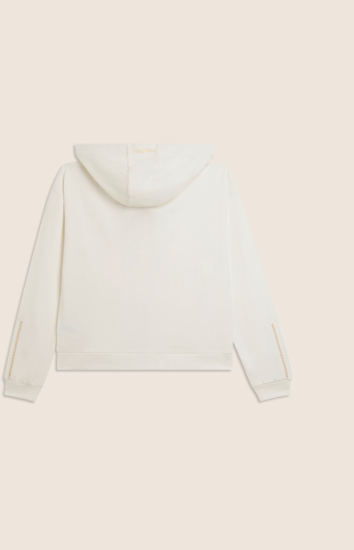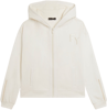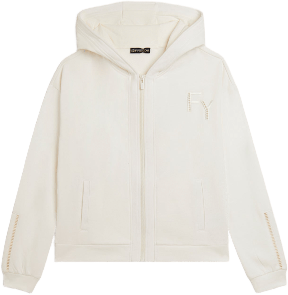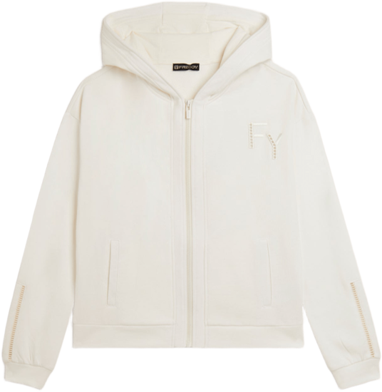 Felpa con cappuccio e chiusura full-zip, caratterizzata da un'accurata vestibilità regular e una lunghezza che arriva appena sopra i fianchi. Il cappuccio foderato in jersey e le maniche lunghe con polsini completano un design comodo e funzionale. Dettagli ricamati, come il logo FY sul cuore e un ricamo traforato lungo il fondo manica, aggiungono eleganza al capo. Le cuciture decorative lungo la zip e le spalle accentuano lo stile sportivo-chic. Realizzata in French Terry, un tessuto morbido e traspirante che unisce il comfort del cotone alla resistenza del poliestere.