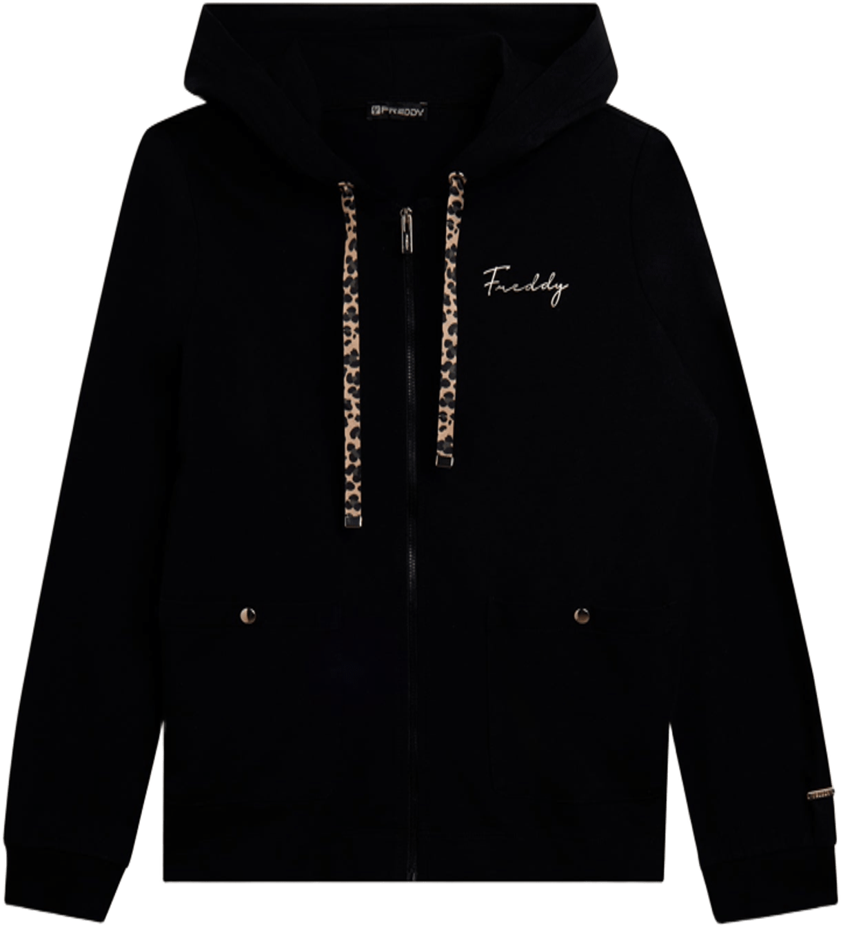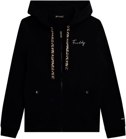 Felpa con cappuccio e zip dalla vestibilità regular, pensata per distinguersi grazie ai dettagli ricercati. Gli spacchi laterali sul fondo sono bordati internamente in viscosa con fantasia animalier, creando un elegante contrasto. Il cappuccio con coulisse è foderato internamente, mentre le maniche lunghe con polsini in costina assicurano comfort. Le taschine quadrate applicate sul davanti aggiungono un dettaglio funzionale e di carattere. Il piccolo logo Freddy in borchie sul cuore e la placchetta dorata con logo FREDDY sul fondo manica sinistro completano il look. Realizzata in heavy jersey stretch di cotone.