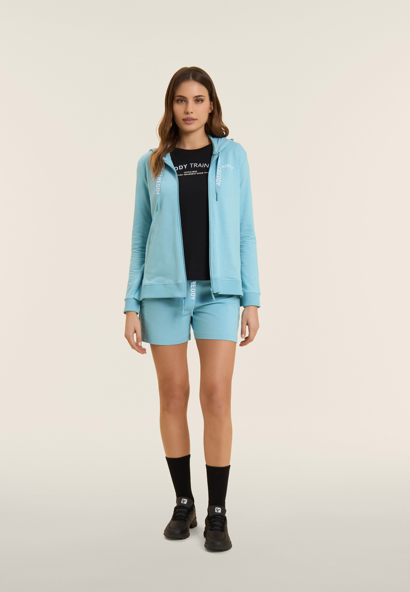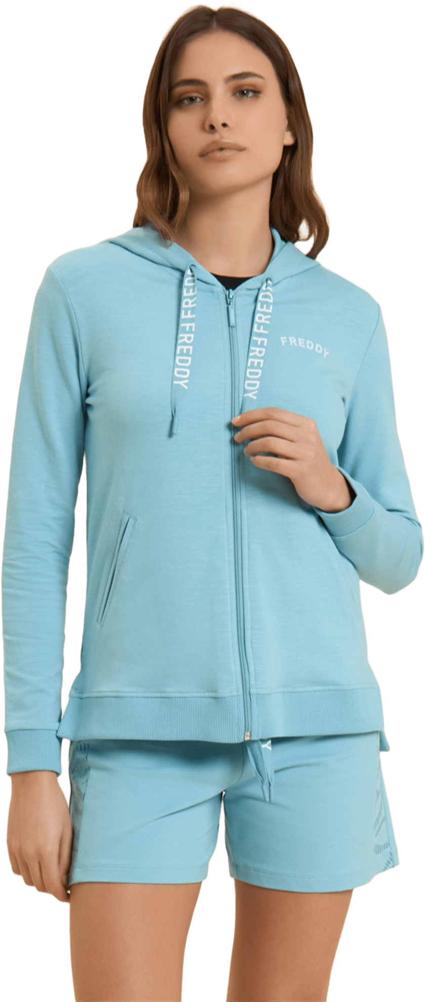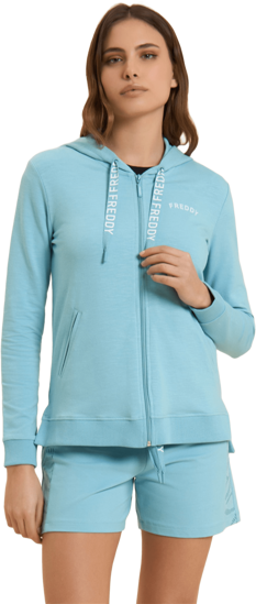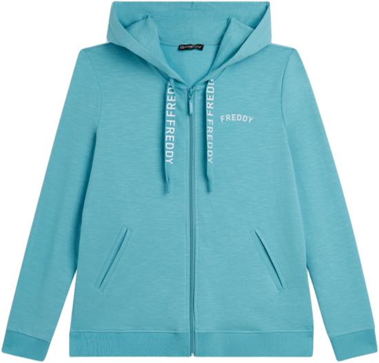 Felpa cappuccio con zip, dalla vestibilità regular e lunghezza perfetta per ogni occasione casual. Il fondo in costina, con spacchi laterali e un retro più lungo, garantisce comfort e stile. Il cappuccio foderato in jersey fiammato con coulisse logate FREDDY aggiunge un tocco distintivo. Le maniche lunghe con polsini in costina completano il design. Un piccolo logo FREDDY stampato sul cuore in bianco glitter e tasche anteriori interne arricchiscono la praticità. Realizzata in French Terry elasticizzato dall'effetto fiammato, questa felpa è ideale per le mezze stagioni o per un uso versatile tutto l’anno.