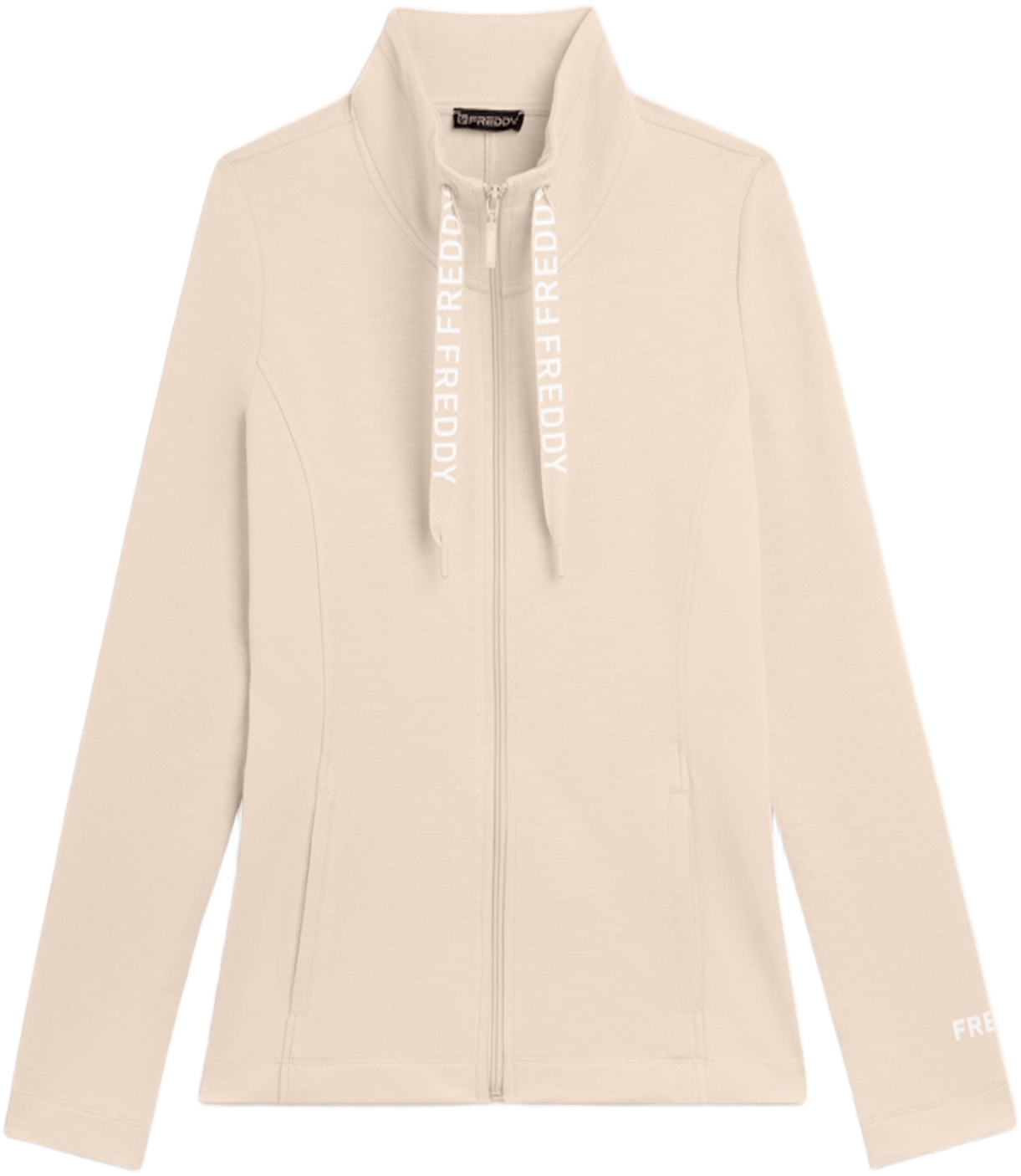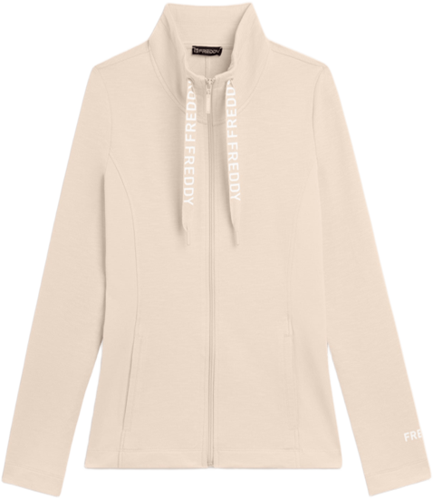 Felpa con zip e collo alto, dalla vestibilità slim e lunghezza regular. Il fondo dritto e il collo alto foderato in jersey fiammato con coulisse logate FREDDY aggiungono un tocco di stile e funzionalità. Le maniche lunghe dritte, senza polsini, completano il design pulito ed elegante. Un piccolo logo FREDDY in bianco glitter sul fondo manica sinistro e tasche anteriori interne arricchiscono la praticità. Realizzata in French Terry elasticizzato dall’effetto fiammato, è perfetta per le mezze stagioni o per un uso versatile.