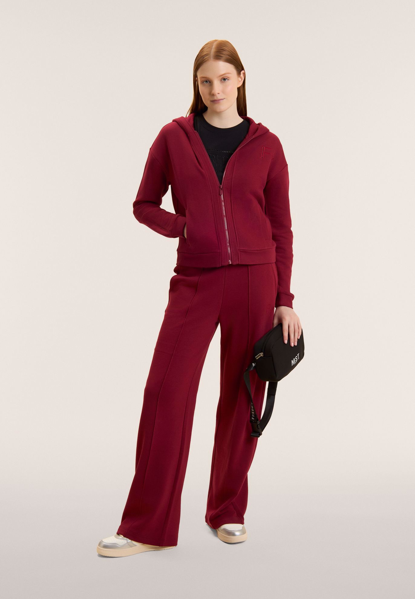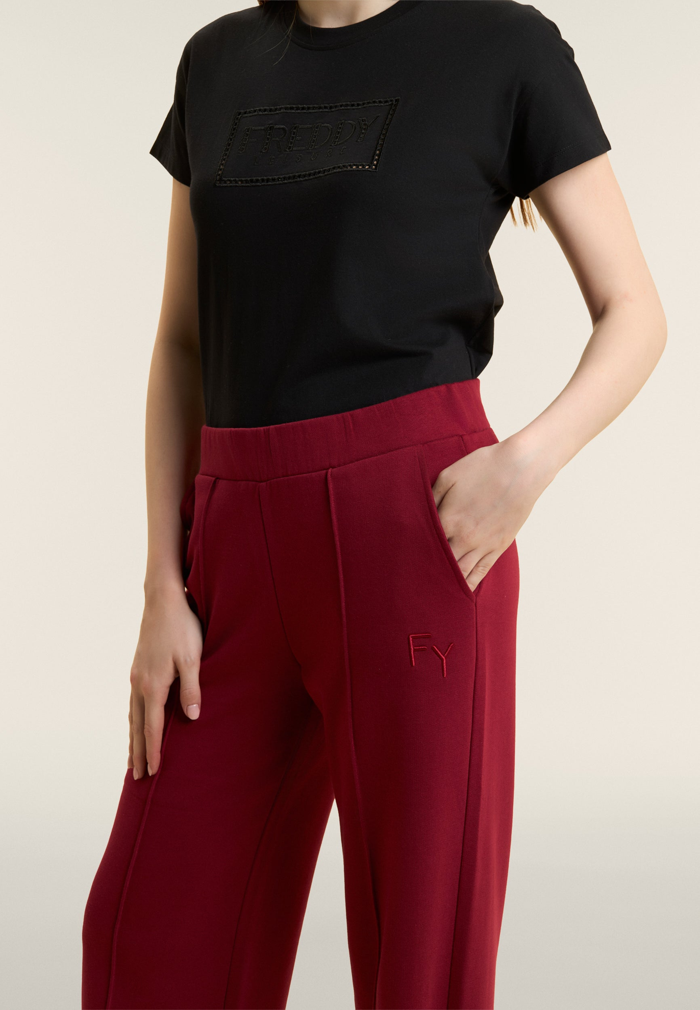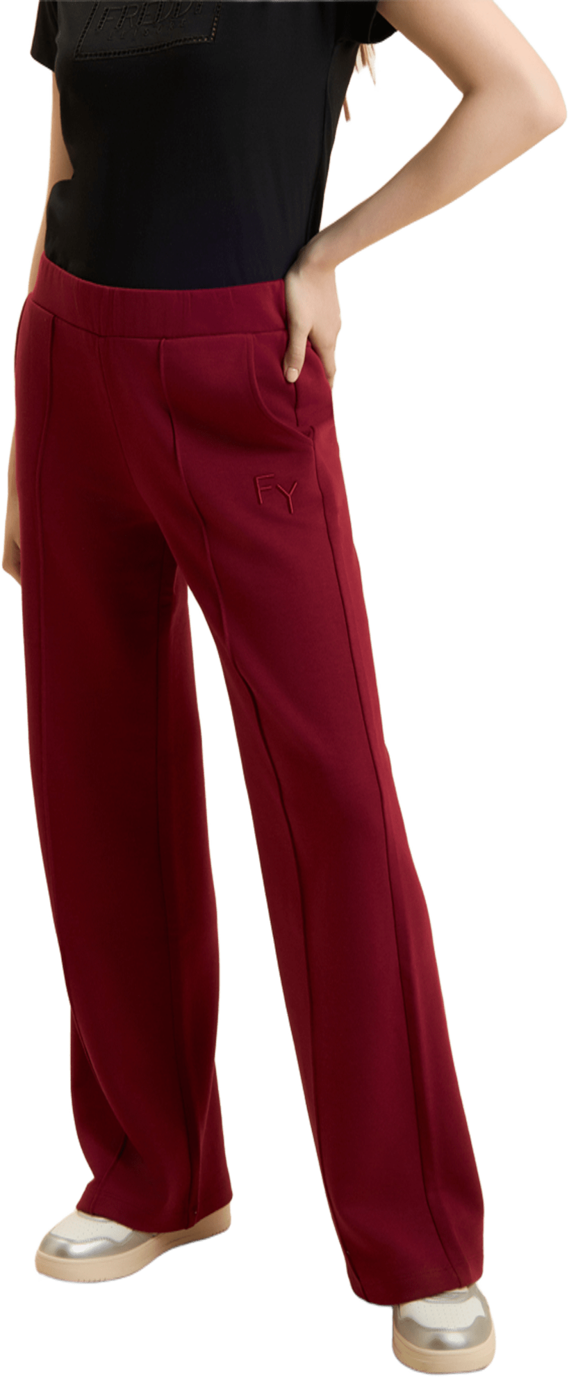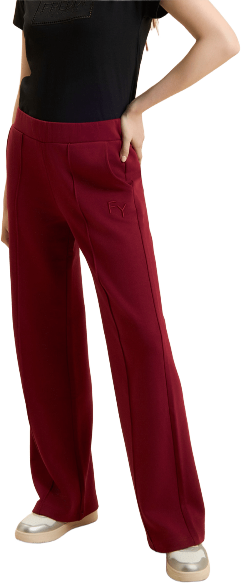 Pantaloni sportivi dalla vestibilità comfort con gamba wide leg e lunghezza e vita regular. Il logo FY ricamato sul fianco e un piccolo logo Freddy stampato sul retro sotto alla vita aggiungono dettagli distintivi. L'impuntura decorativa al centro della gamba valorizza il taglio, mentre le tasche interne offrono praticità. Realizzati in French Terry, un tessuto morbido e traspirante che garantisce il massimo del comfort.