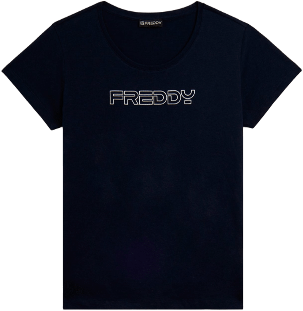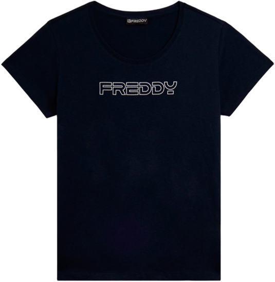 T-shirt a manica corta dal design essenziale e vestibilità regular, con fondo dritto e scollo girocollo. Il logo FREDDY in outline, stampato in bianco glitter, dona un tocco luminoso e sofisticato al capo. Realizzata in jersey leggero di 100% cotone, è ideale per un look casual ma raffinato, facilmente abbinabile a qualsiasi outfit.