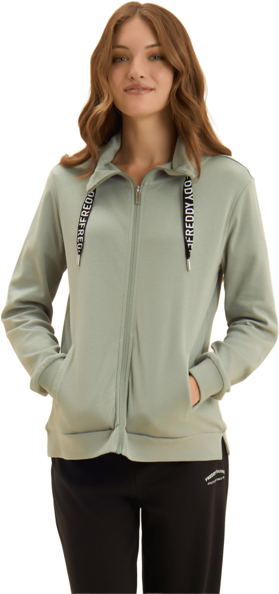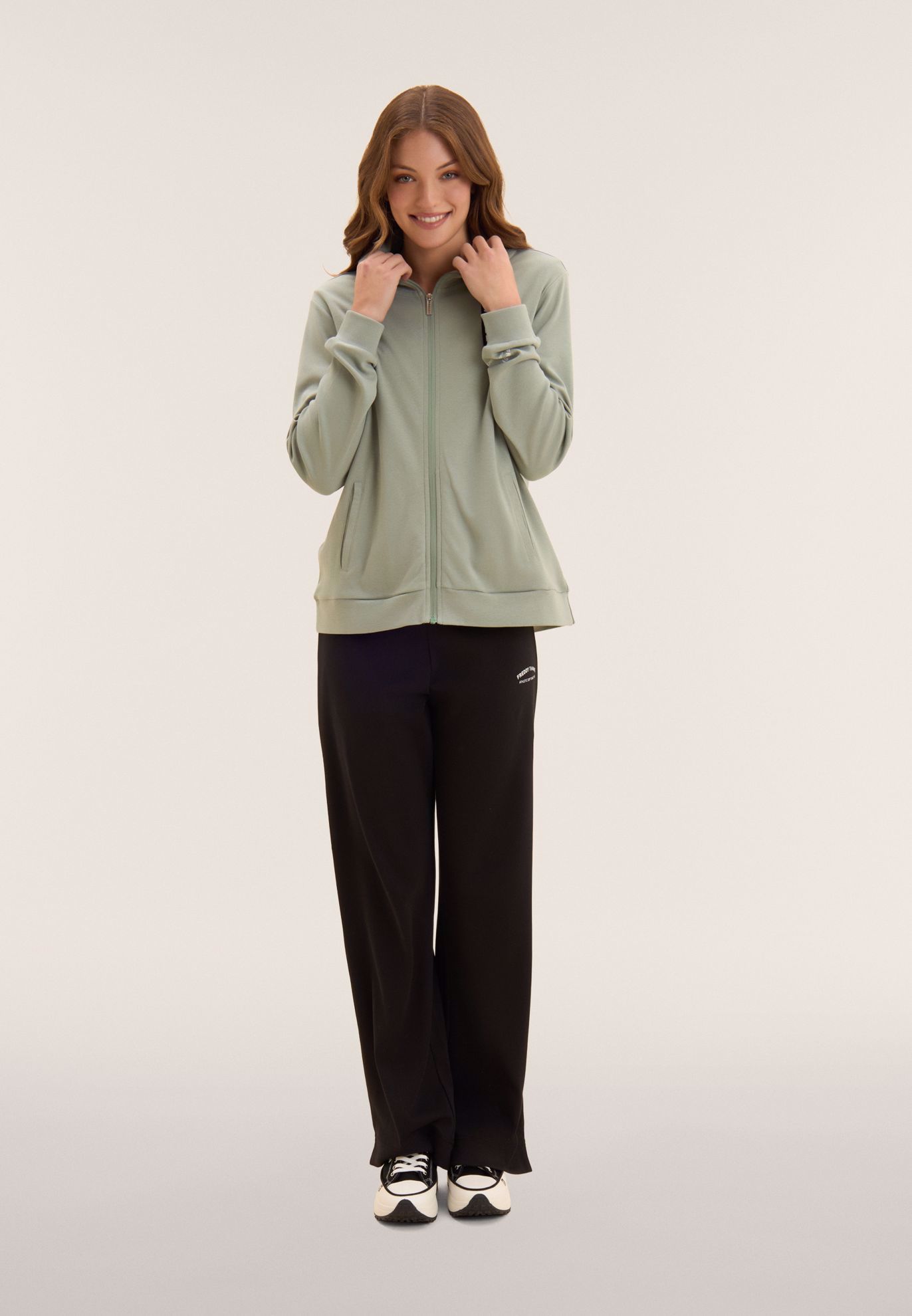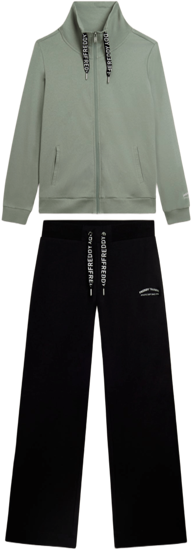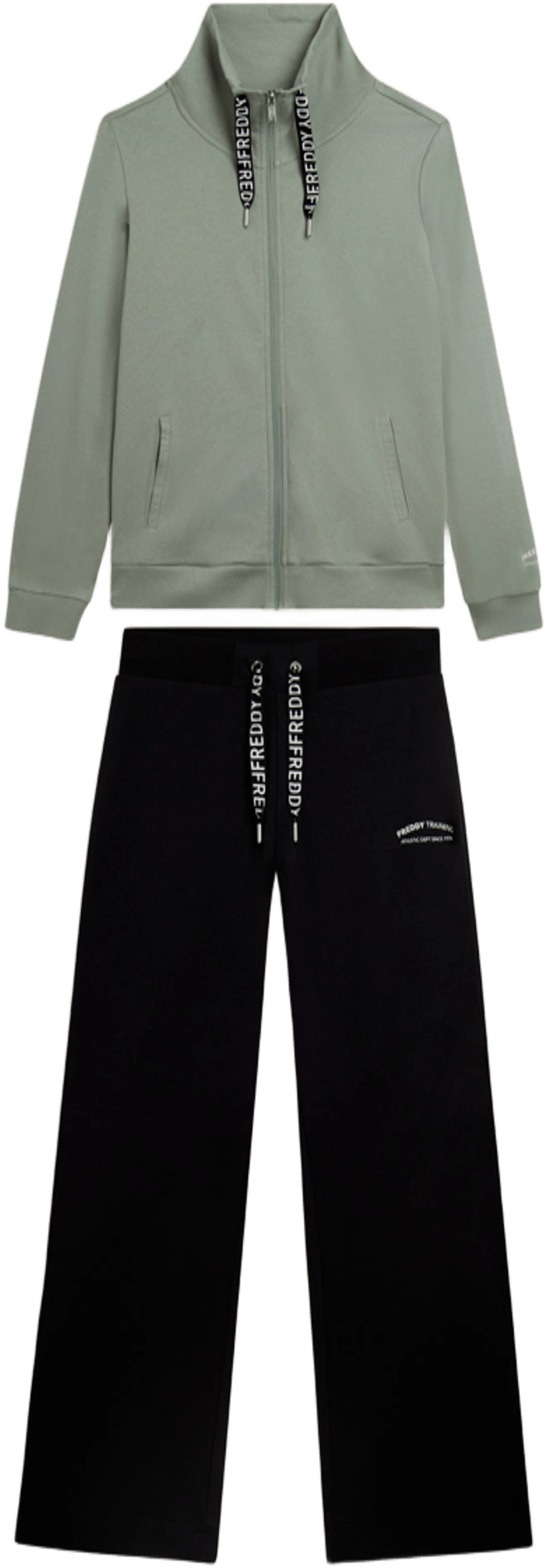 Tuta confortevole in interlock di 100% cotone, naturalmente morbido e traspirante. Felpa con zip tono su tono, collo alto con coulisse logata, spacchi laterali e maniche con polsini. I pantaloni wide leg hanno vita regular con coulisse logata e fondo con piccoli spacchi laterali. Logo FREDDY glitter bianco su manica e fianco. Tasche interne sulla felpa.