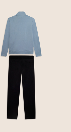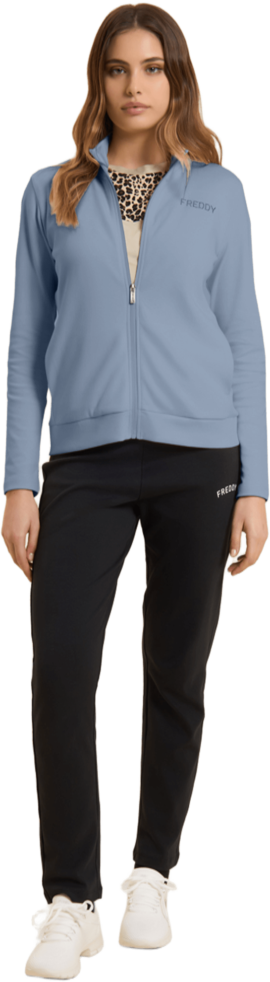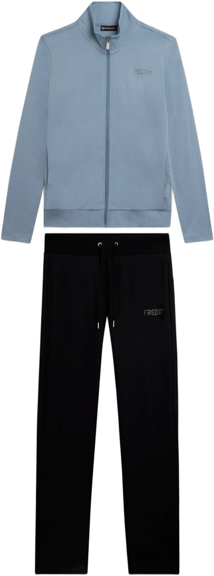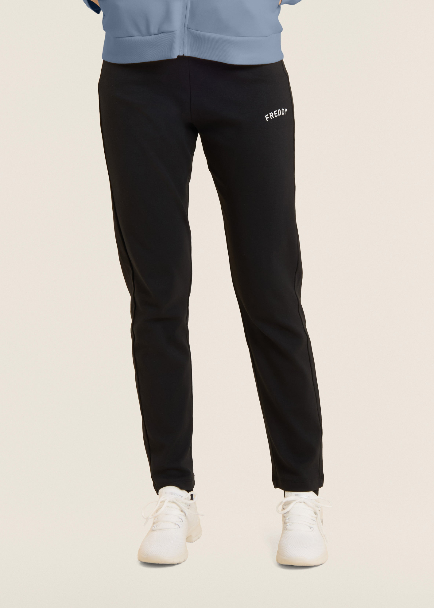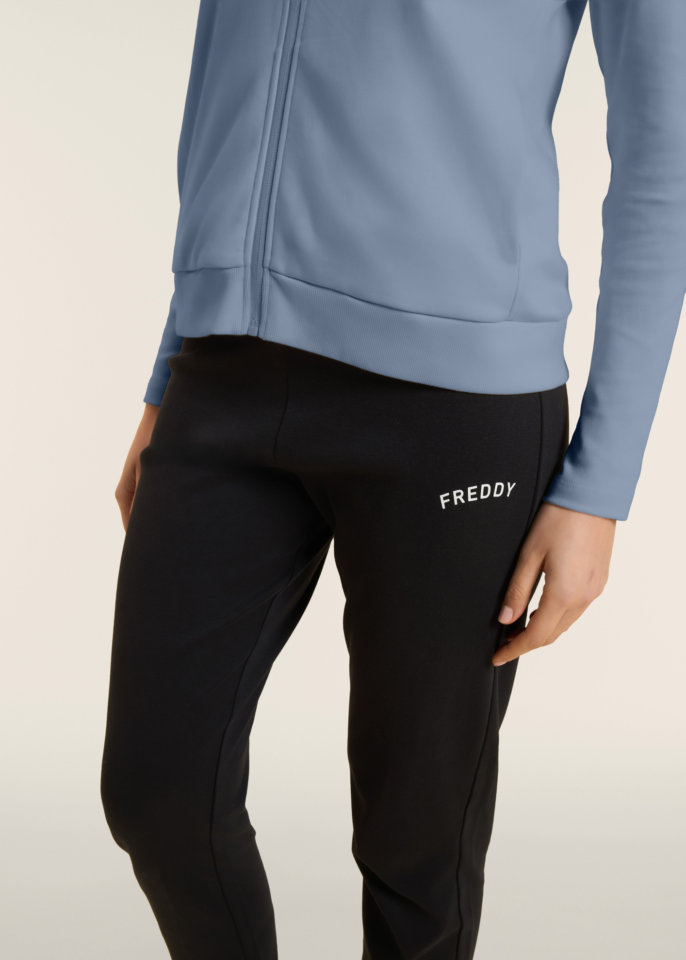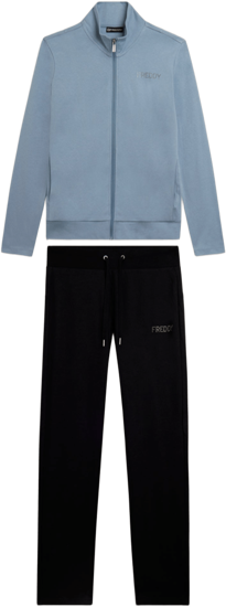 Questa tuta in interlock 100% cotone unisce eleganza e comodità. La felpa ha zip tono su tono, collo alto e maniche aderenti senza polsini, con fascia in costina al fondo. I pantaloni sono regular fit con coulisse e fondo dritto. Il logo FREDDY con strass dona un tocco brillante su cuore e fianco. Tasche anteriori interne sulla felpa.